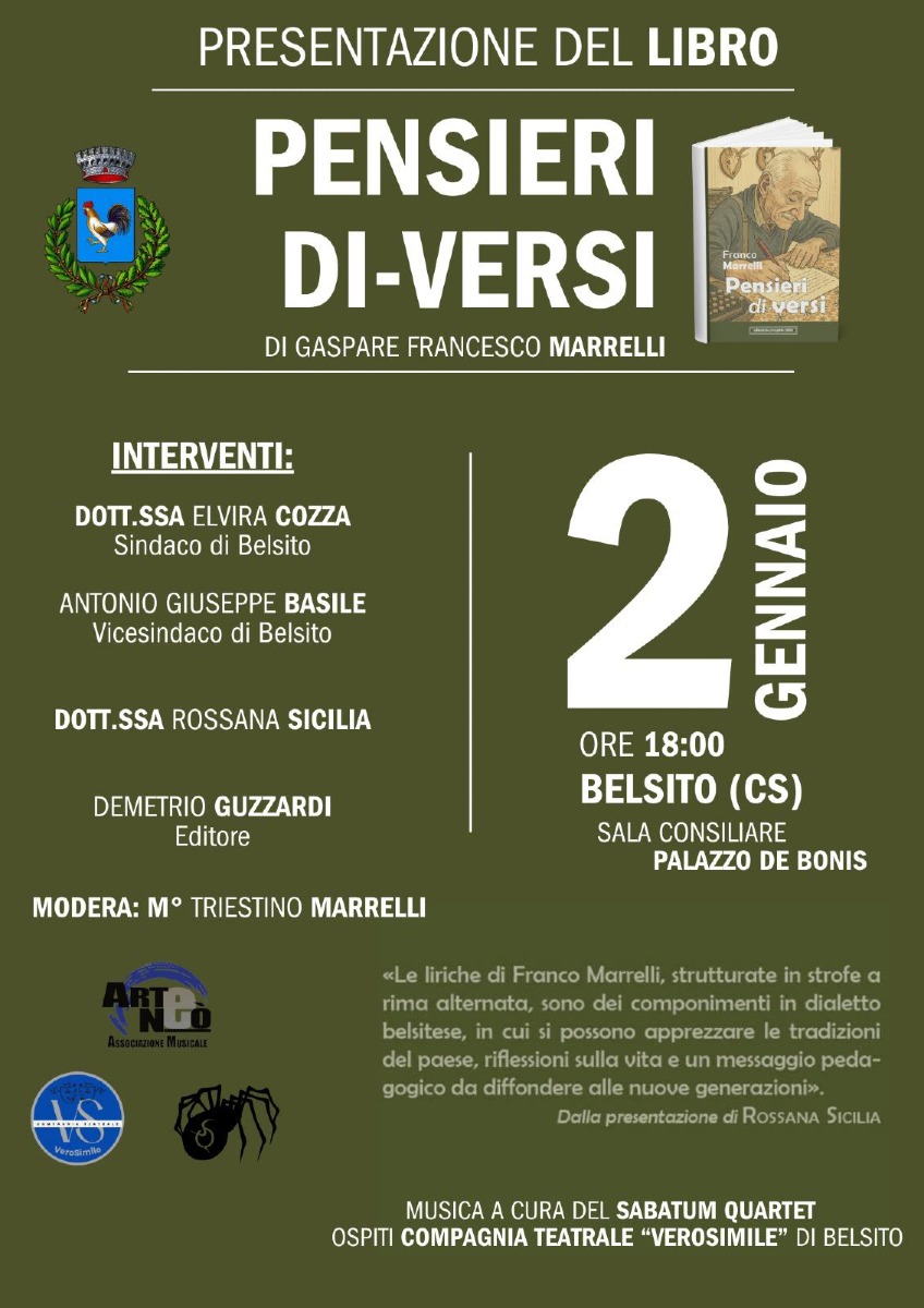 Belsito - La Sala Consiliare del Comune di Belsito, all’interno dello storico Palazzo De Bonis, ospiterà venerdì 2 gennaio alle ore 18:00 la presentazione del libro “Pensieri Di-Versi” di Gaspare Francesco Marrelli, un’opera che affonda le radici nella tradizione poetica locale e nella memoria collettiva del paese. L’iniziativa rappresenta un momento di valorizzazione della cultura belsitese e delle sue espressioni più autentiche.