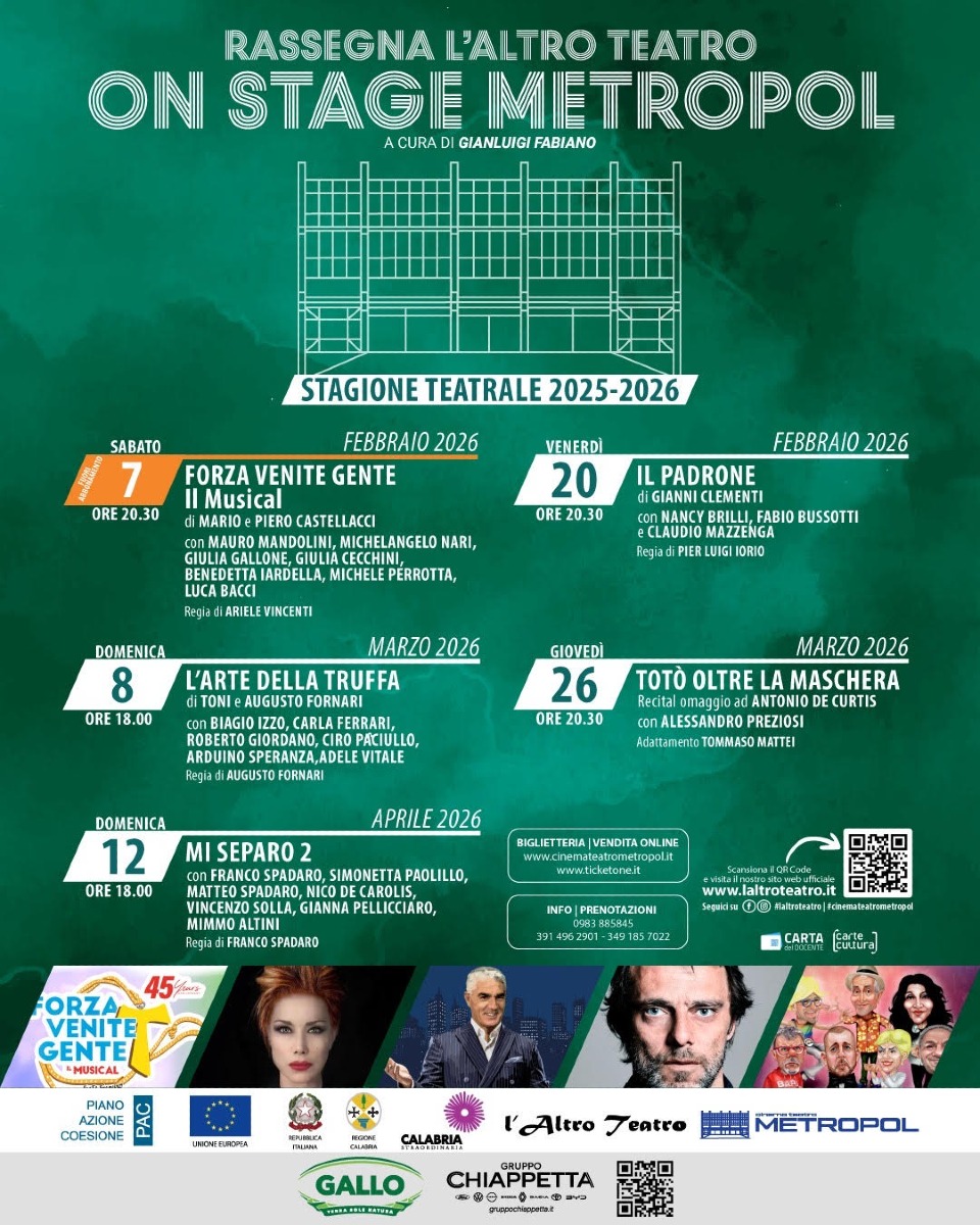 Corigliano-Rossano - Si alza il sipario sulla nuova stagione della “Rassegna L’Altro Teatro – On Stage Metropol”, che da febbraio ad aprile 2026 porterà sul palco del Cinema Teatro Metropol di Corigliano Rossano commedie, musical, recital d’autore, testi capaci di unire intrattenimento e qualità artistica.
