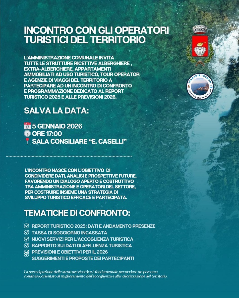 Diamante - Il Comune di Diamante organizza un incontro con gli operatori turistici locali per avviare un percorso di crescita e valorizzazione del settore. L'incontro si terrà il 5 gennaio 2026, alle 17:00, presso la Sala Consiliare “E. Caselli”.