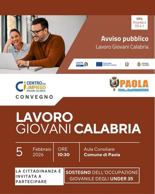 L'incontro si terrà giovedì 5 febbraio 2026, alle ore 10.30, presso l'Aula Consiliare del Comune di Paola. Un'opportunità imperdibile per chiunque sia interessato a conoscere le nuove prospettive di lavoro e crescita professionale offerte dalla Regione Calabria.