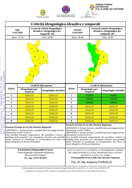 Crotone - Nuova comunicazione da parte della Protezione Civile della Calabria. A partire dalle ore 00:00 fino alle ore 24:00 di domani, domenica 1° febbraio 2026, è stato emesso un Avviso di criticità idrogeologica e idraulica per temporali. Si tratta di una previsione di Allerta Meteo Gialla.