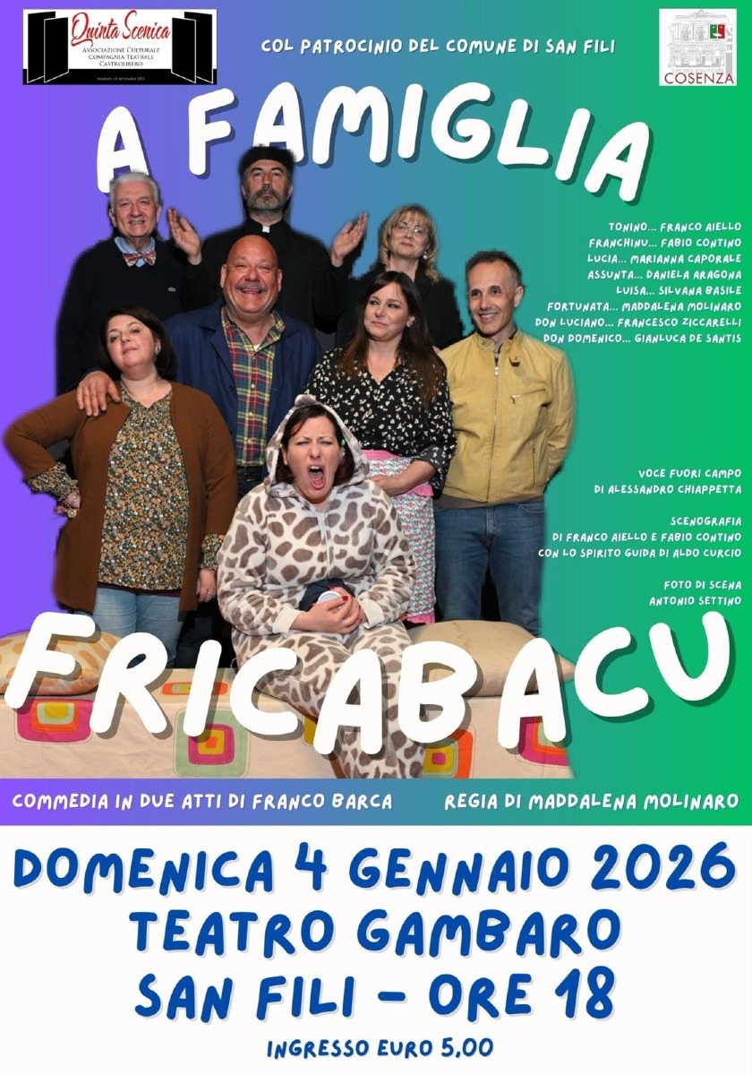 San Fili - Il Comune di San Fili è lieto di annunciare l’arrivo al Teatro “F. Gambaro” della Compagnia Quinta Scenica, che porterà in scena il capolavoro 'A Famiglia Fricabacu di Franco Barca, drammaturgo cosentino. Questo spettacolo, che segna il trentesimo anniversario del debutto dell’opera, rappresenta un autentico classico del teatro calabrese contemporaneo. L’appuntamento è fissato per il 4 gennaio 2026, alle ore 18:00, presso il Teatro Gambaro di San Fili. Il costo del biglietto è di € 5,00.